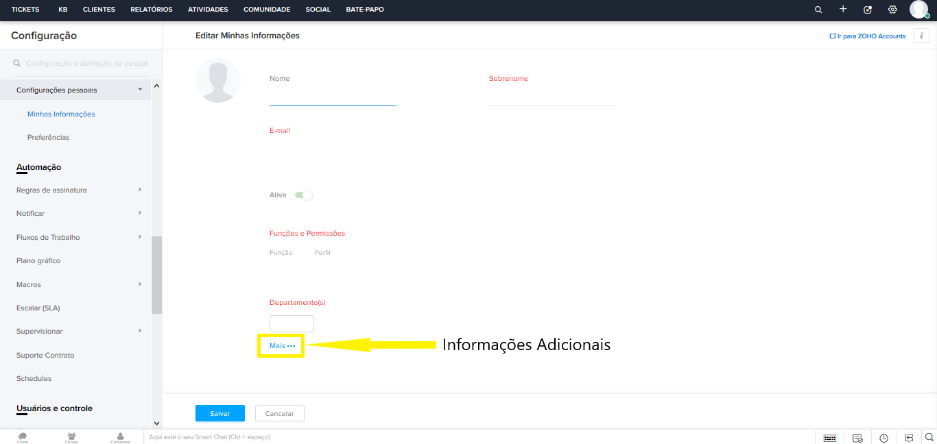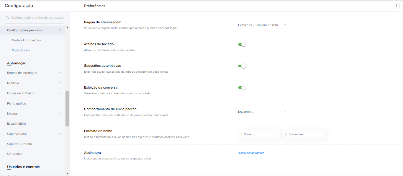 Em certos momentos podemos precisar fazer alguma alteração em nossas configurações pessoais, tais como nome, idioma, assinatura, atalhos e outras, mas vale lembrar que nem todas configurações podem ser alteradas devido ao perfil e permissões de cada usuário.