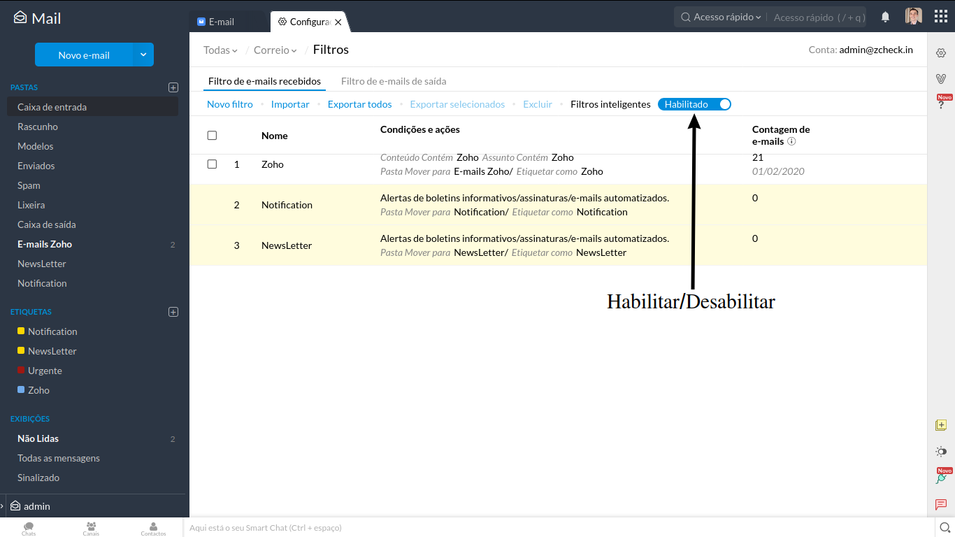 O Zoho Mail apresenta dois filtros ditos inteligentes (Newsletters e Notification) que filtram, movem para respectivas pastas e etiquetam automaticamente novos e-mails, você pode também criar um
