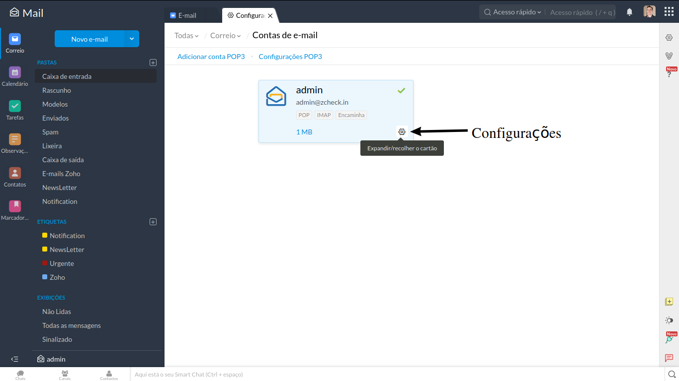 1) Entre na sua conta Zoho Mail e entre em configurações