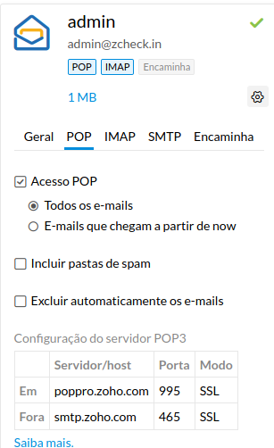 Nome do servidor de entrada: poppro.zoho.comPorta: 995Requer SSL: Sim Nome do usuário: "e-mail da organização"